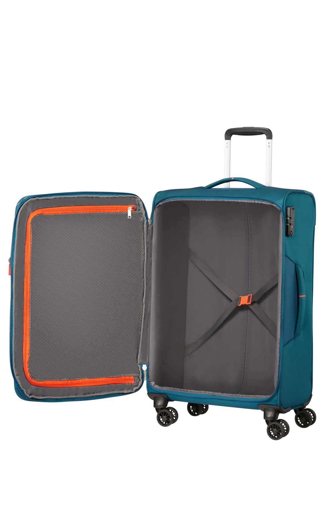 Maleta de viaje mediana de 67 cm con 4 ruedas de apoyo y expandible de American Tourister modelo Crosstrack en color azul y detalles naranjas